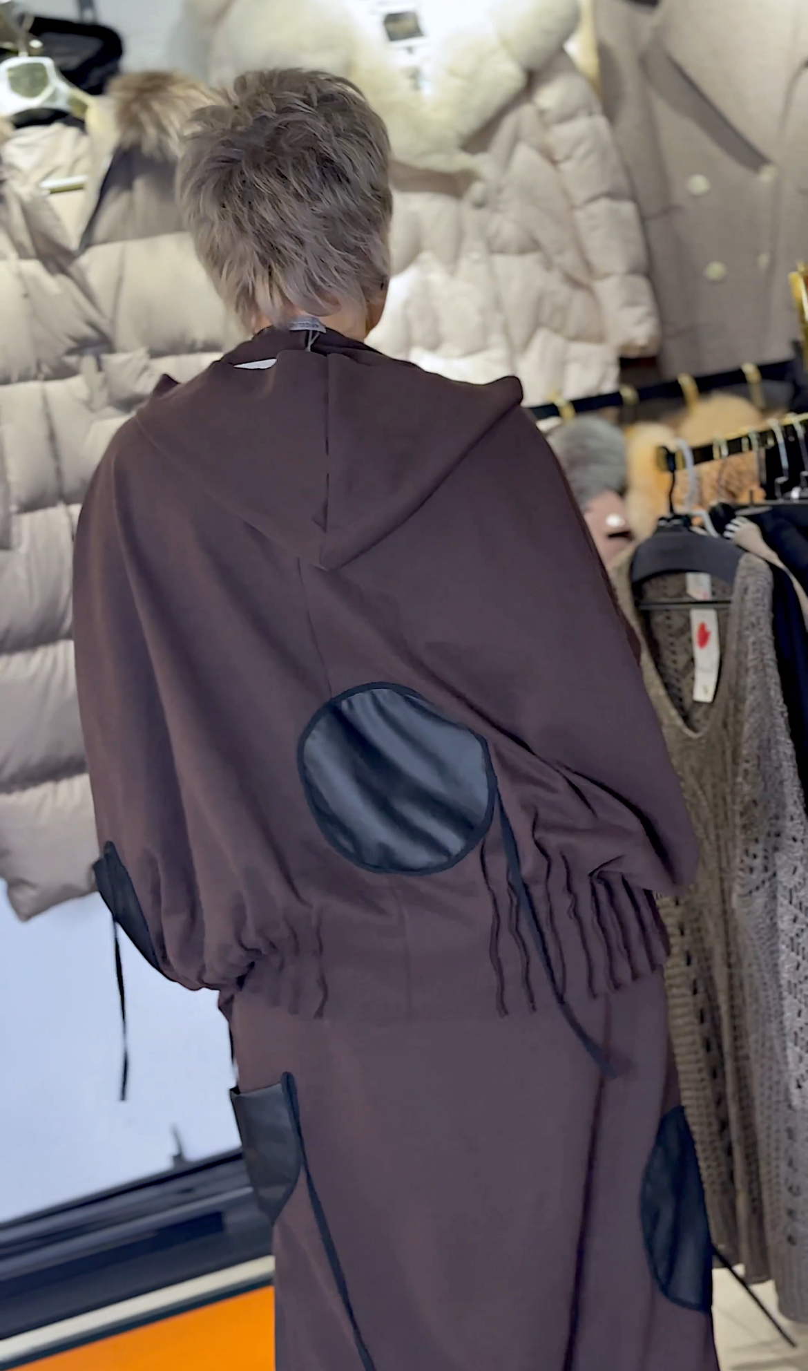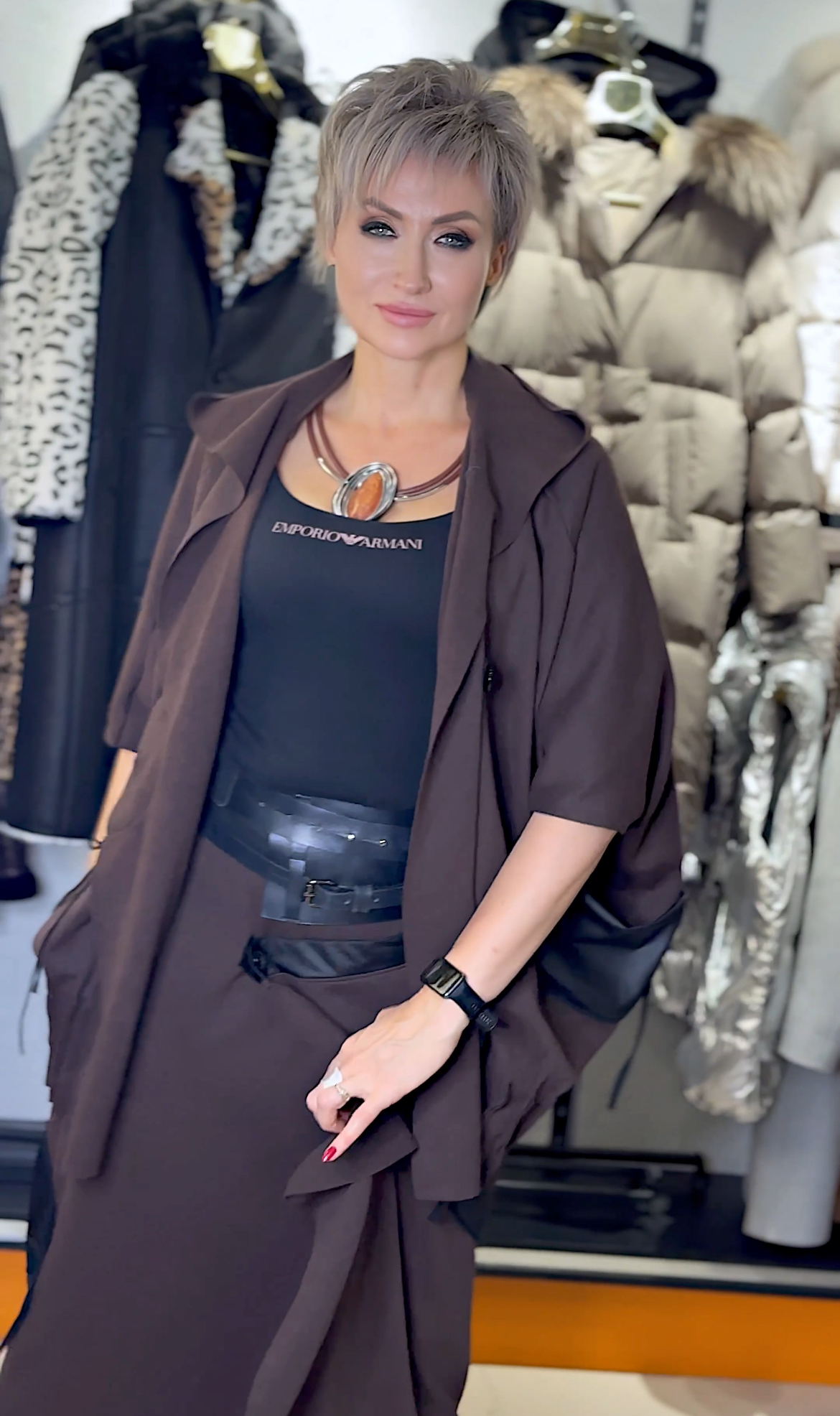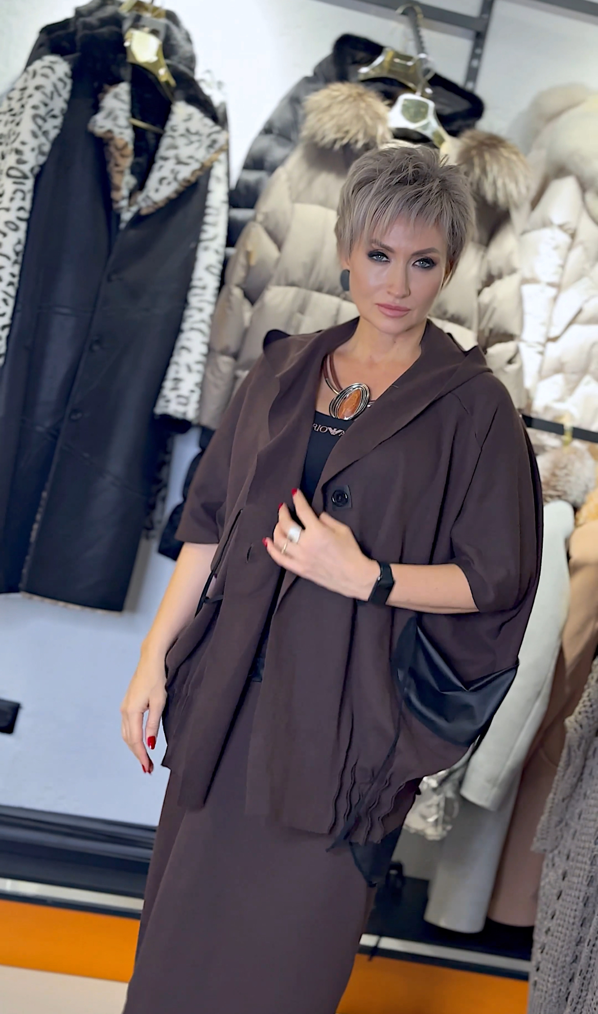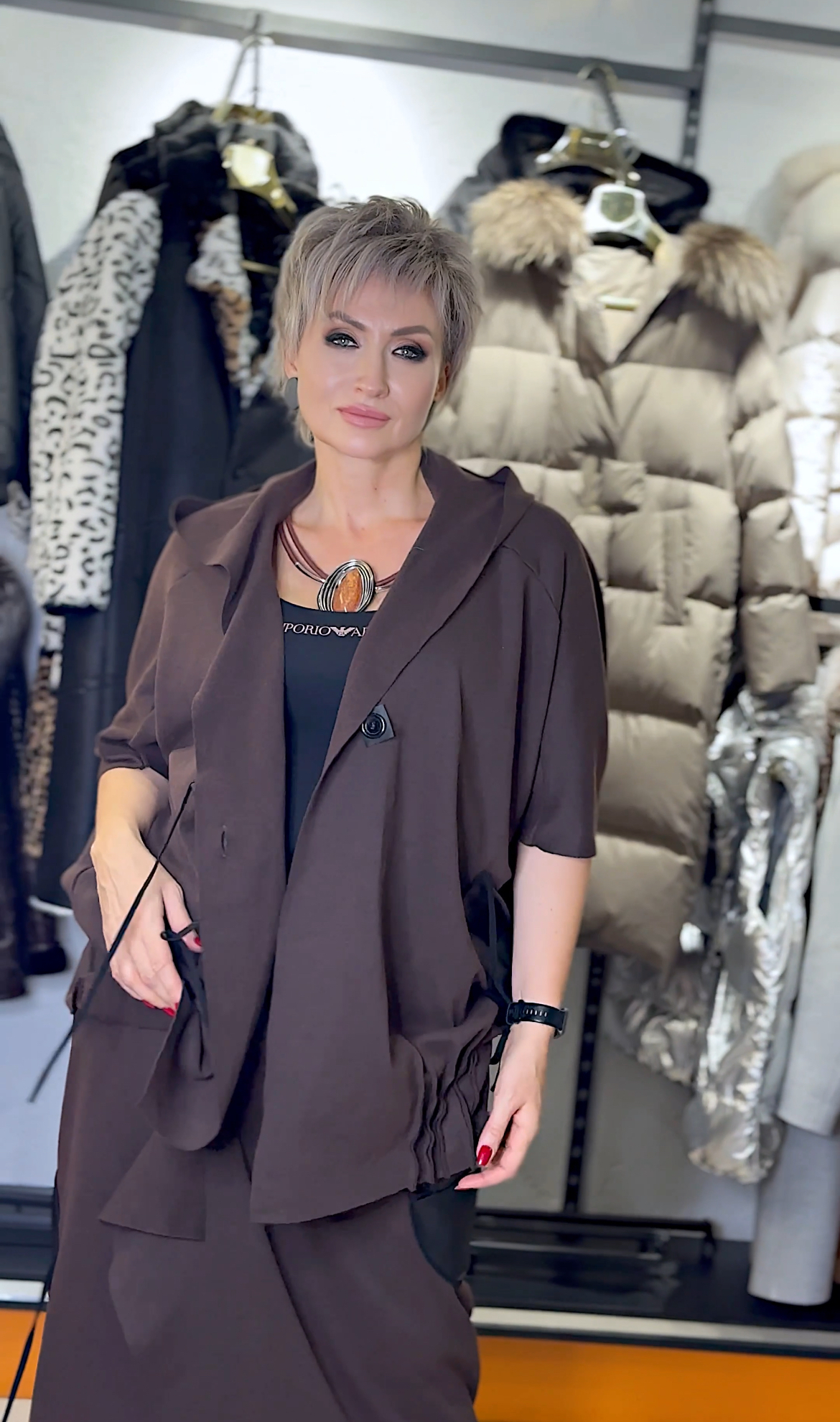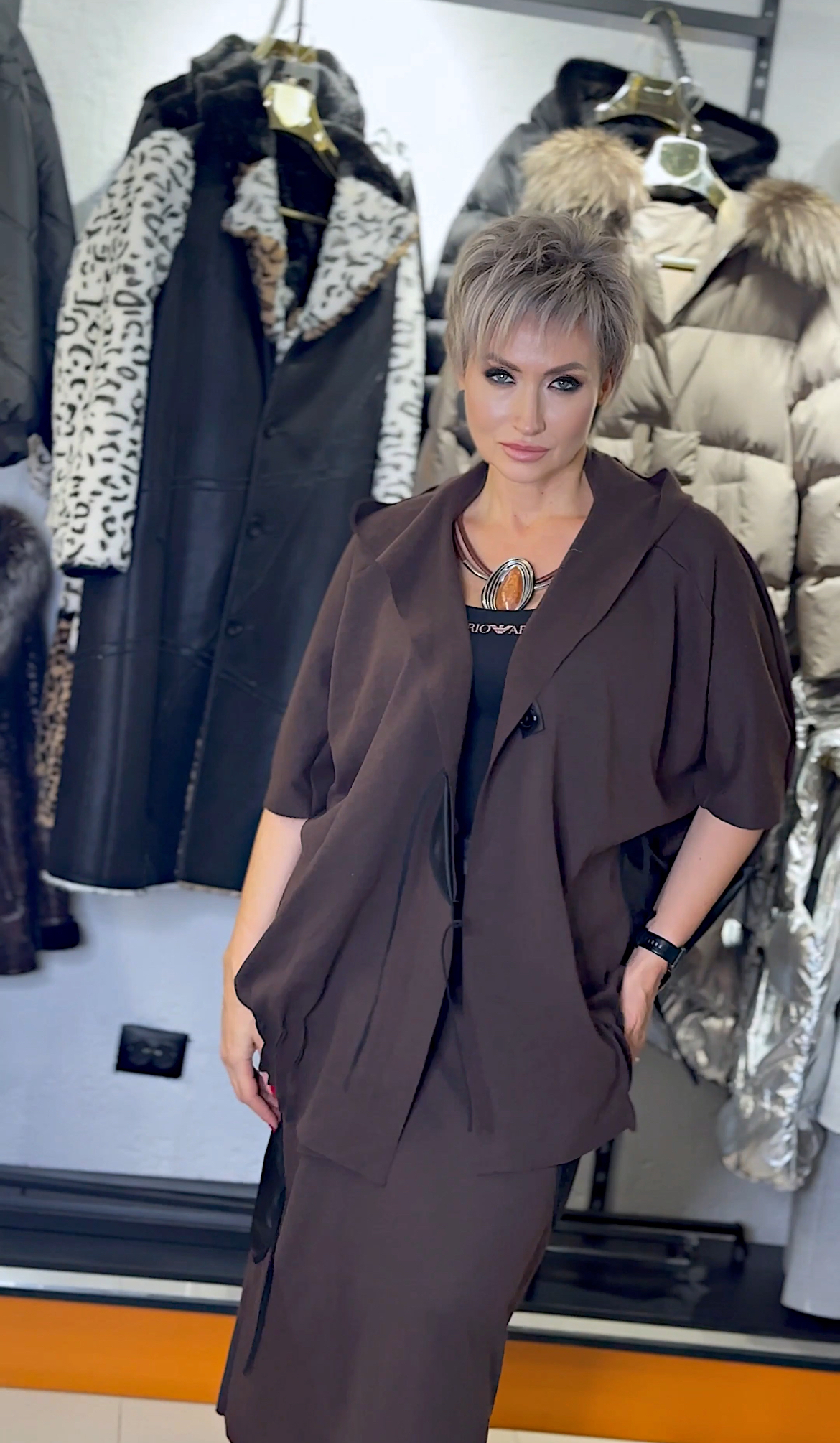 • Плотный трикотаж в тёплом шоколадном оттенке — уютно и выразительно