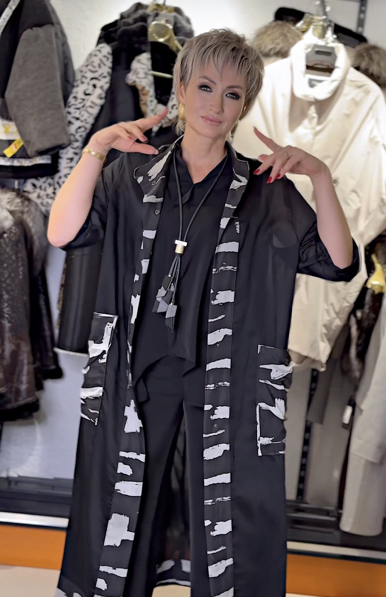 • Удлинённая накидка с графичным принтом добавляет акцент