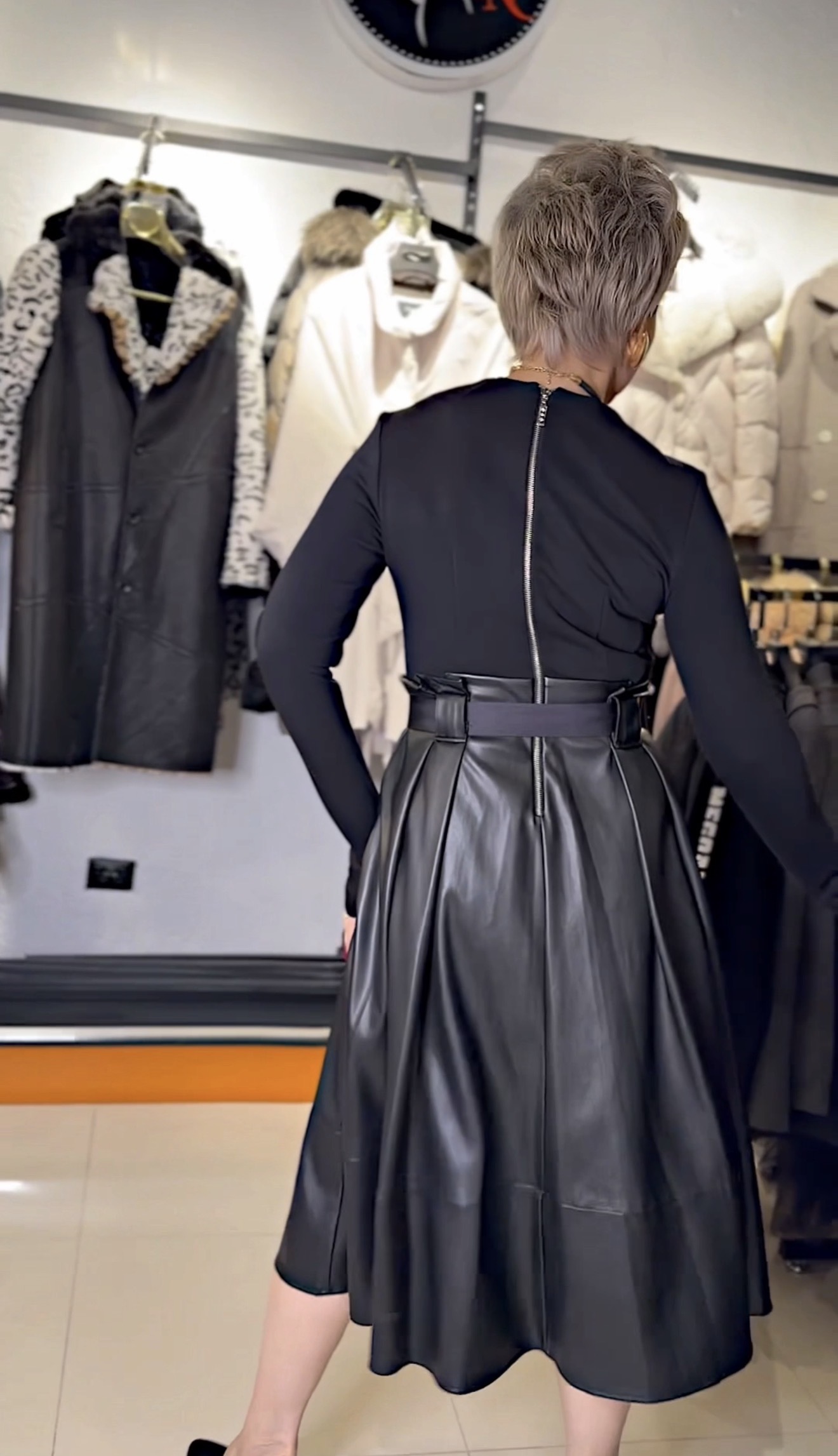 • Эффектный крой: плотный верх + расклешённая юбка из экокожи