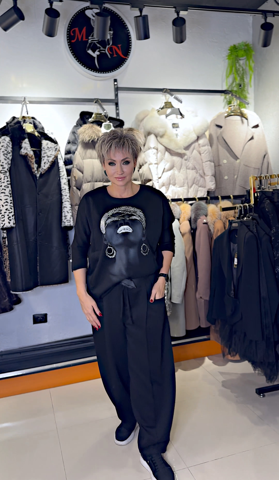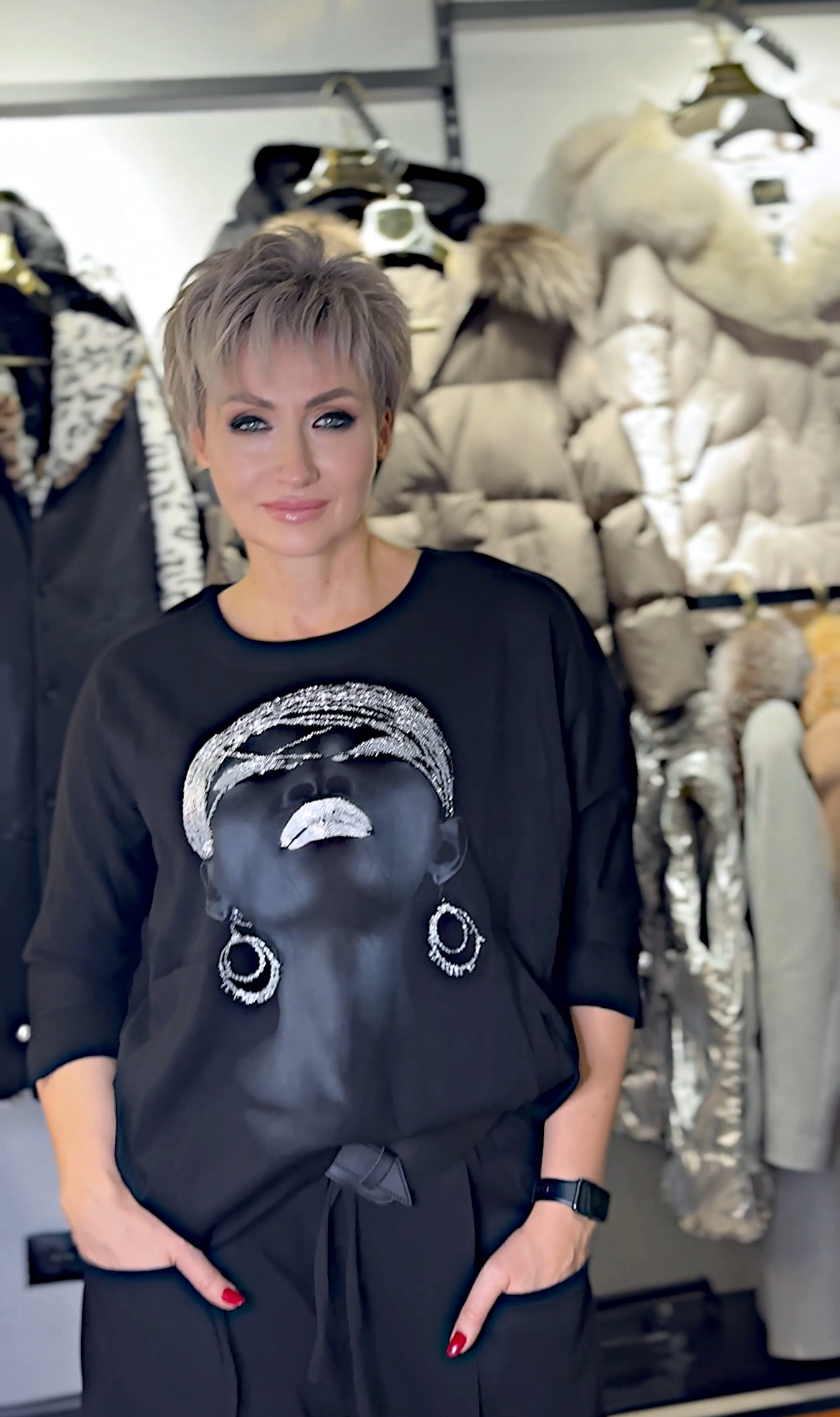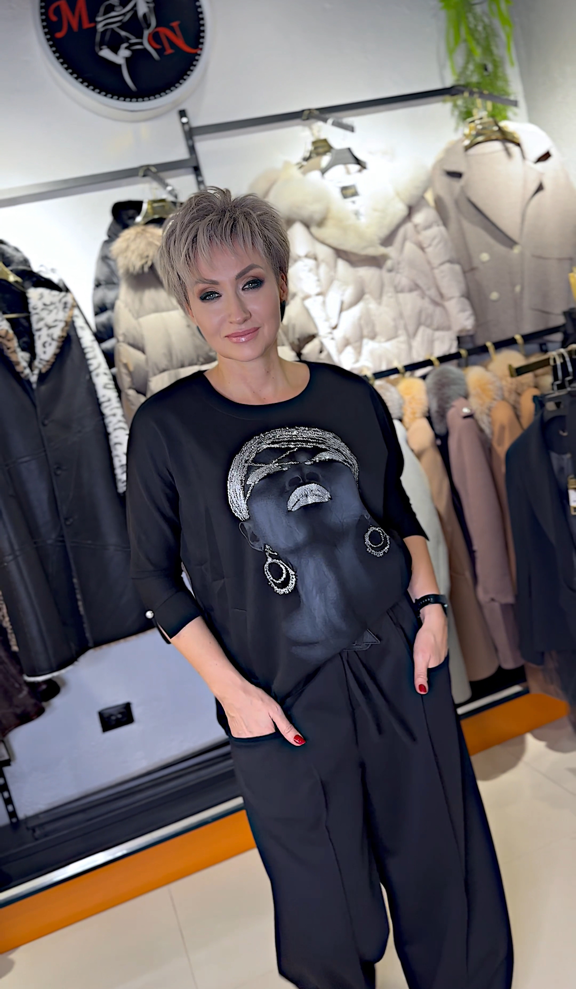 • Эффектный фотопринт с женским лицом делает образ запоминающимся
