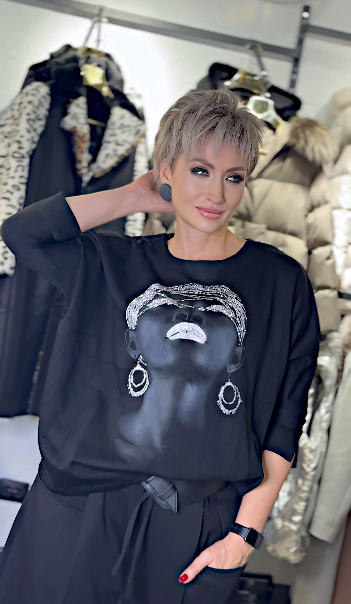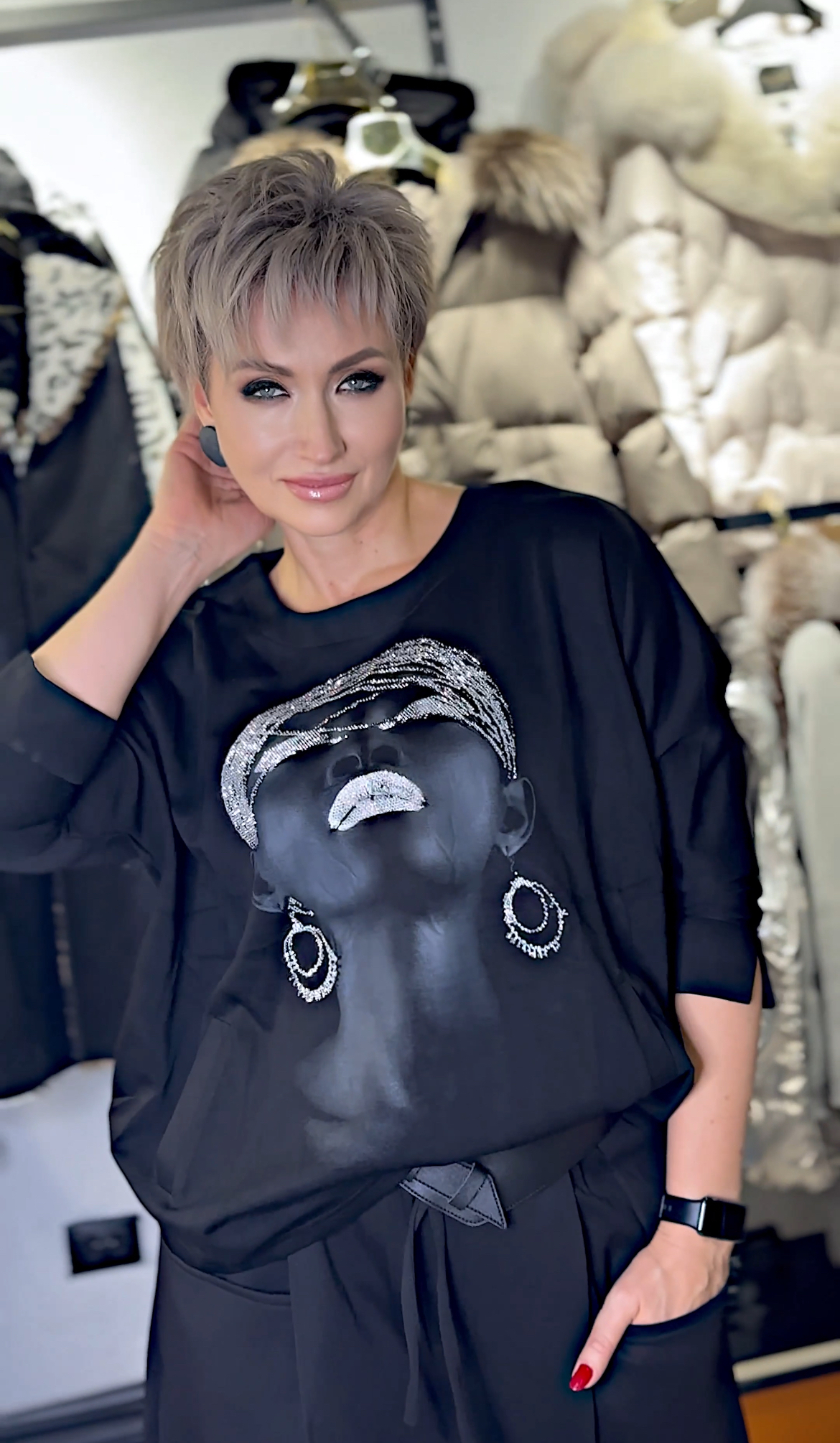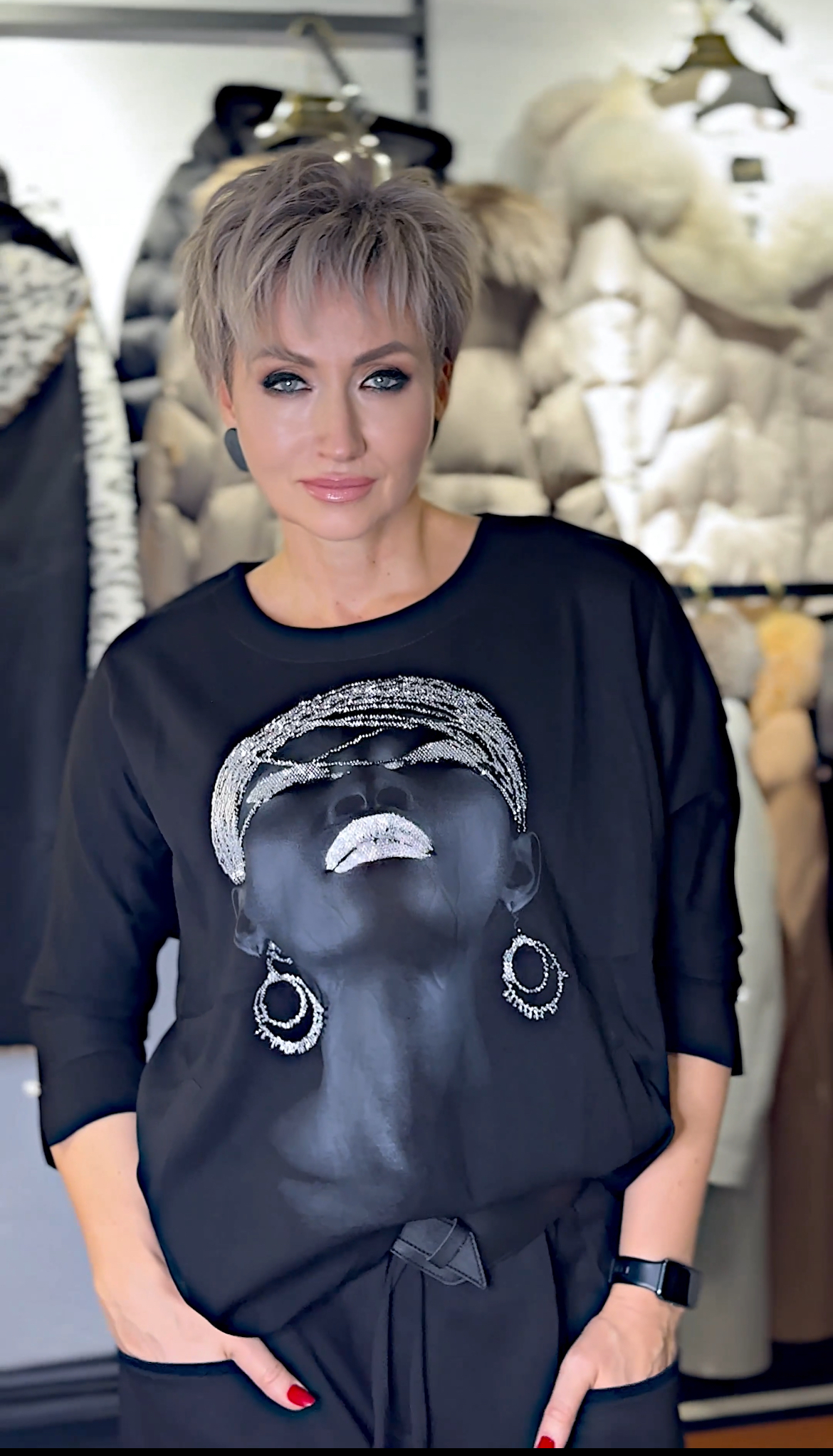 • Эффектный фотопринт с женским лицом делает образ запоминающимся